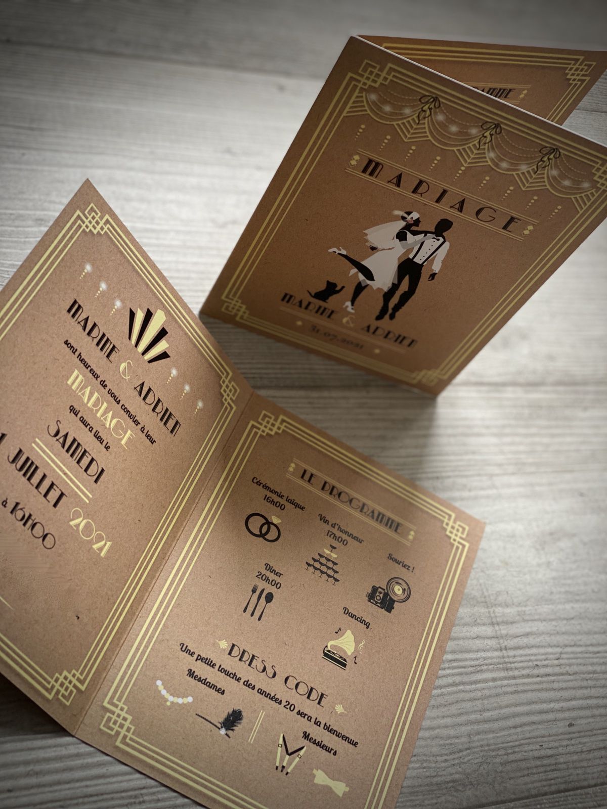 création invitation faire part papeterie mariage sur mesure originale personnalisée 1 pli 12x17cm fermé #efdcbysoscrap kraft charleston année 20 années folles Gatsby rétro art déco pictogrammes programme du dday planning du jour à personnaliser couleur et texte couple danseurs musiciens