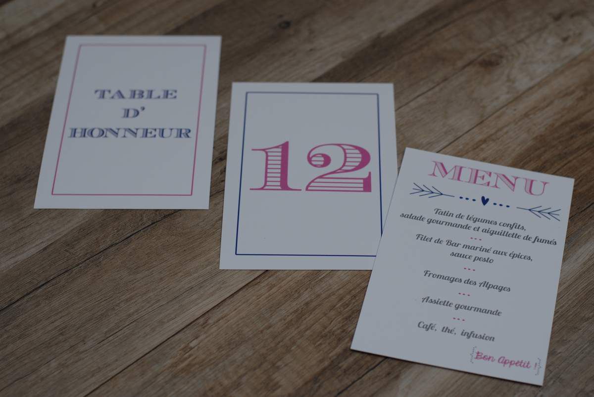 - menus 10x15cm recto verso avec le chiffre de la table et table d'honneur